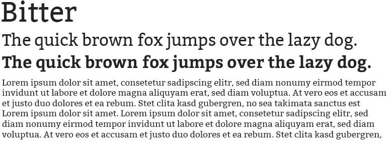 Die Bitter wurde von Sol Matas designed. Sie ist eine clean Serifen-Schrift und eignet sich für den Einsatz auf Bildschirmen. Der normale Regular Schnitt der Font ist etwas dicker, was ein sehr dunkles Schriftbild erzeugt. Leider hat die Bitter nur drei Schriftschnitte, was sie eher für Headlines interessant macht. Dennoch hat die Bitter eine sehr gute Lesbarkeit und macht sich auch auf kleinen Bildschirmen optimal.