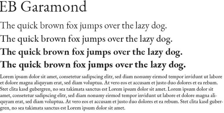 Die Garamond kann als Mutter aller Schriften bezeichnet werden. Bei Google Fonts finde ich die EB Garamond wesentlich traditioneller als die Coromant Garamond.Georg Duffner achtet beim Erstellen der EB Garamond darauf, den ursprünglichen Charakter der Schrift zu erhalten. So sieht die Schrift noch wie damals im Buchdruck aus. Auch wenn Serifen Schrift funktional keinen Sinn mehr auf modernen Screens machen, ist es doch mittlerweile ein Webdesign Trend Serifen Schrift für Headlines zu verwenden.