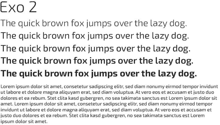 Die Exo2 Schrift erinnert etwas an die Spacigkeit der Titillium, hat jedoch ihren eigenen Charakter. Auch wenn die Schrift futuristisch wirkt, kann sie trotzdem durch die geometrische Konstruktion eine gewisse Eleganz versprühen. Der organische Look der Exo 2 eignet sich  (als Weiternentwicklung der Exo) wesentlich besser für kleinere Schriftgrößen. Deshalb kannst du die Exo 2 auch als Fließtext Schriftart einsetzen.