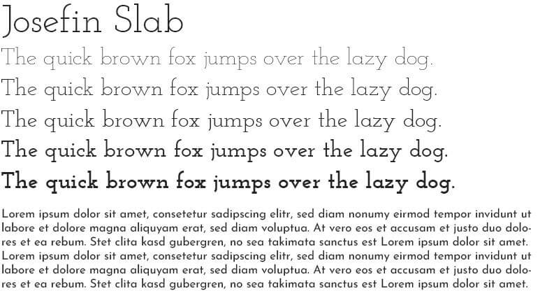 Die Josefin Slab ist das Gegenstück zur serifenlosen Josefin Sans und wurde ebenfalls von Santiago Orozco entwickelt. Die Josefin Slab ist (wie die Josefin Sans) sehr geometrisch und bildet zusammen mit den kantigen Serifen einen schönen Kontrast. Wie die Josefin Sans sollte auch die Josefin Slab nicht für Fließtext verwendet werden. Dennoch bildet Sie eine sehr schöne Schrift für Headlines.