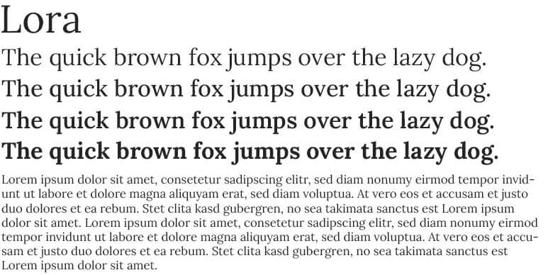 Diese Schriftart wurde von Olga Karpushina im Jahr 2011 entwickelt. Die Lora Font ist eine moderne Serifen-Schrift, die ihre Wurzeln in der Kalligrafie hat. Der Kontrast der Lora eignet sich auch gut für längere Fließtexte. Kalligrafisch angehauchte Kurven verleihen der Lora einen ganz eigenen Charakter und heben sie von anderen Serifen-Schriften ab. Trotz der Serifen wurde die Lora für die Benutzung auf Bildschirmen optimiert. Zudem entwickelte Lexei Vanyashin im Jahr 2013 noch den Kyrilischen Zeichensatz.