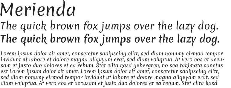 Die Merienda wurde von Eduardo Tunni entwickelt. Die weiche Formsprache zeichnen diese Schrift besonders für Überschriften aus. Besonders schön sind auch die Details der Schrift. Merienda gibt es in zwei Schnitten. Diese Schrift wartet nur darauf Headlines zu verschönern und deinem Weblayout mehr Höhe zu verleihen.
