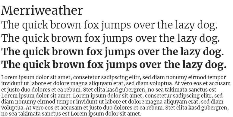 Die Merriweather wurde von Eben Sorkin entworfen und wurde zum Lesen auf Bildschirmen erstellt. Kräftige Serifen und eine ausgeprägte x-Höhe verleihen der Merriweather eine gute Lesbarkeit. Die Merriweather wird auch heute noch ständig weiterentwickelt. Diese Google Font ist auch meine Lieblings-Serifen Schrift und kommt oft zum Einsatz. Sehr schön finde ich die subtilen Serifen im Vergleich zur Garamond, die diese Serifen-Schrift sehr modern erscheinen lässt.