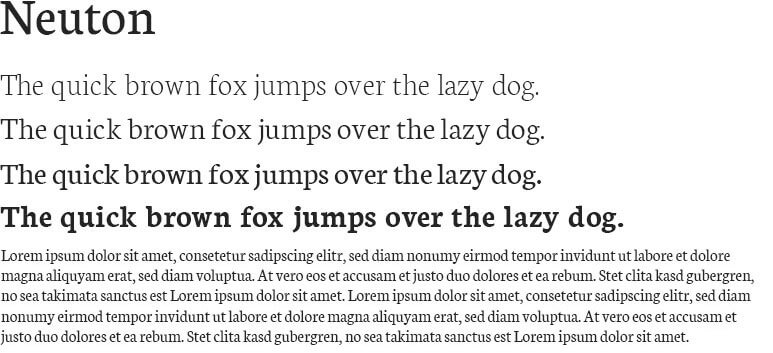 Die Neuton ist eine niederländische Serifen-Schrift. Sie hat eine große Höhe und eine kompakte Breite. Damit bietet dir diese Schrift eine ökonomische Platznutzung – vorallen auf kleinen Bildschirmen. Besonderes Merkmal ist hier die Italic-Variante der Schrift. Diese wurde besonders betont. Die Neuton ist eine sehr charakteristische Schrift, die sicherlich ihre Daseinsberechtigung hat. Ich bevorzuge für das Web aber eher serifenlose Schriften und wenn’s dann doch mal eine romanische Schriftart sein muss, dann doch eher das Original – die Garamond.