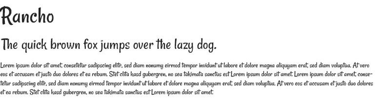 Die Rancho Schriftart ist eine Brush Script Font die beispielsweise in einem Country Club zur Anwendung kommen könnte. Es gibt leider nur einen Schnitt – als Überschrift Font jedoch völlig ausreichend. Die Ungleichmäßigkeiten der Grundlinie verleihen dieser Schrift einen selbstgeschriebenen Charakter.