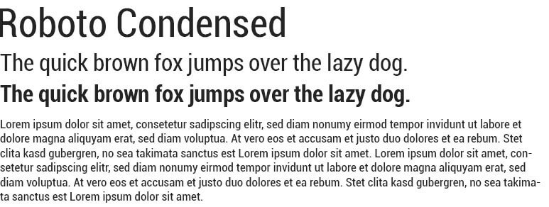 Die Roboto Condensed ist eine Alternative zur Roboto. Du kannst die Roboto Condensed überall da verwenden, wo wenig Platz ist. Allerdings wird durch den Condensed Schnitt auch die Lesbarkeit beeinflusst. Trotzdem ist die Roboto Condensed eine der beliebtesten Schriften.