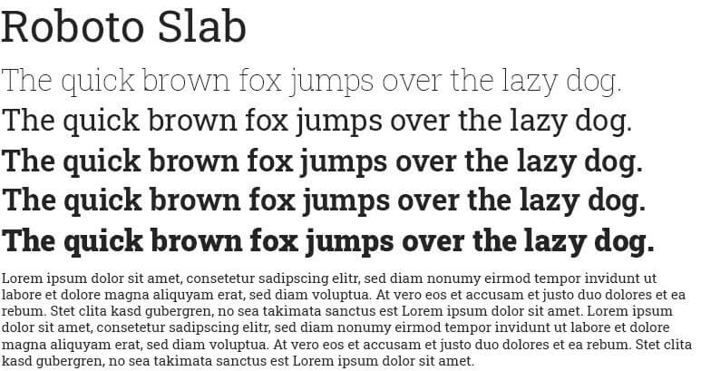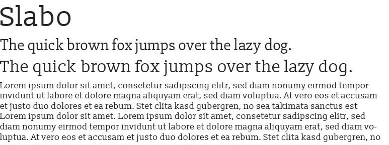 Der Designer John Hudson entwickelte die Slabo für Online Werbung und andere netzbezogene Anwendungen. Die Slabo 27px (der große Bruder der Slabo 13px) steht leider nur in einem Schnitt (Regular 400) zur Verfügung. Dennoch ist dieser Font bei Google Web Fonts sehr beliebt. Dabei eignet sich die Slabo 27px eher als Headline. Die Schrift harmoniert mit der Roboto als Fließtextschrift oder auch mit der Source Sans Pro.