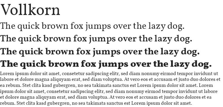 Die Vollkorn wurde bereits 2005 von Friedrich Althausen nach der Bauhaus-Universität in Weimar entwickelt. Als ganze Familie erschien die Schrift 2010 als eine der ersten Schriften im Google Webfont Verzeichnis. Die Vollkorn ist eine sehr traditionelle Schrift und ist (wie die EB Garamond) als Fließtext Schrift wie auch als Headline Schrift verwendbar.