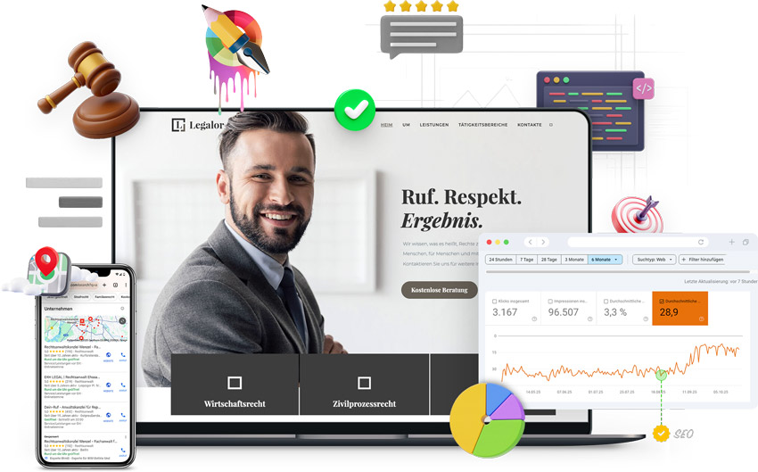 Ihre neue Website ist mehr als nur eine Visitenkarte – sie ist Ihr wichtigstes Tool im Kanzleimarketing. Mit gezielter Optimierung sorgen wir dafür, dass potenzielle Mandanten suchen und finden. Die Sichtbarkeit zu erhöhen bedeutet, dort präsent zu sein, wo Ihre Zielgruppe unterwegs ist.